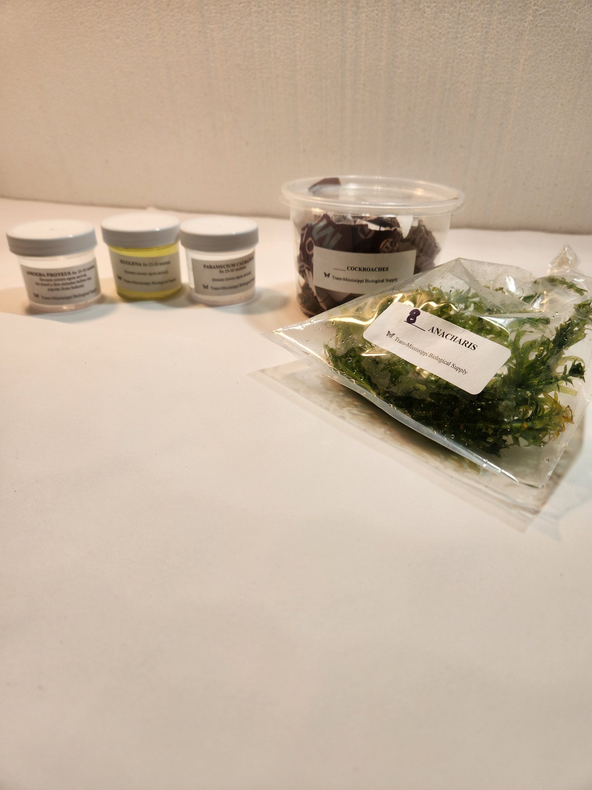 Set includes: 1 jar Amoeba Proteus, 1 jar Paramecium Caudatum, 1 jar Euglena, 8 Anacharis, & 8 Madagascar Hissing Cockroaches.