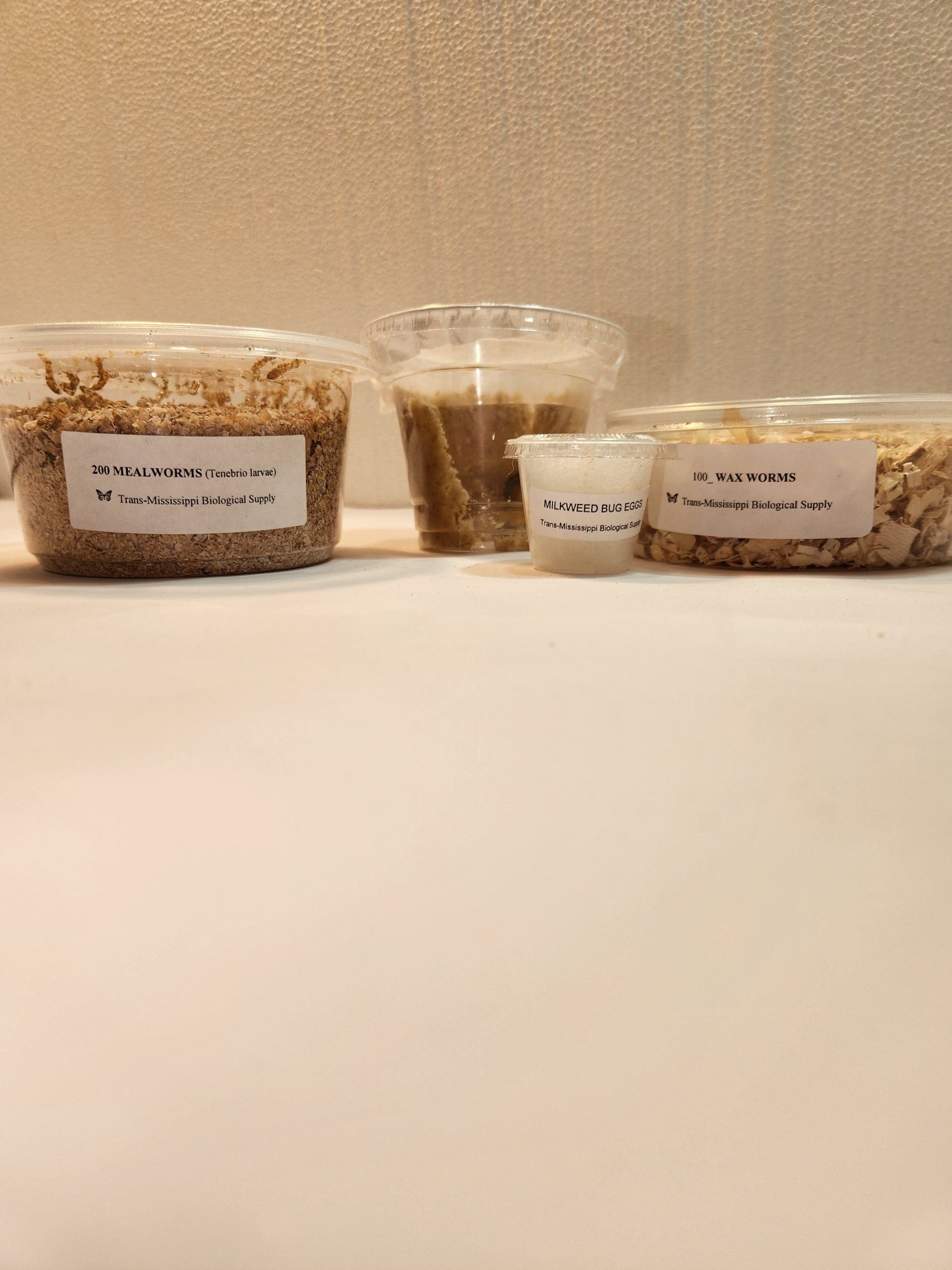 Set includes: 200 Mealworms, 100 Waxworms, 25 Milkweed Bug Eggs, 6 Butterfly Larvae.