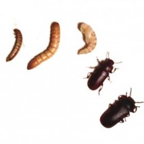 Contains an assortment of larvae (mealworms), pupae, and adult beetles (at least 100 combined insects), perfect for studying the life cycle of Tenebrio.